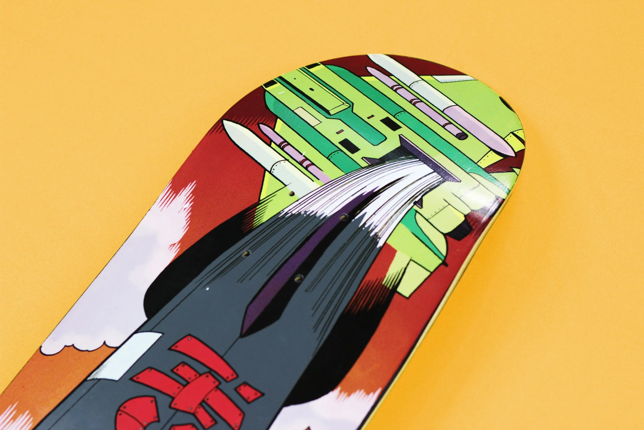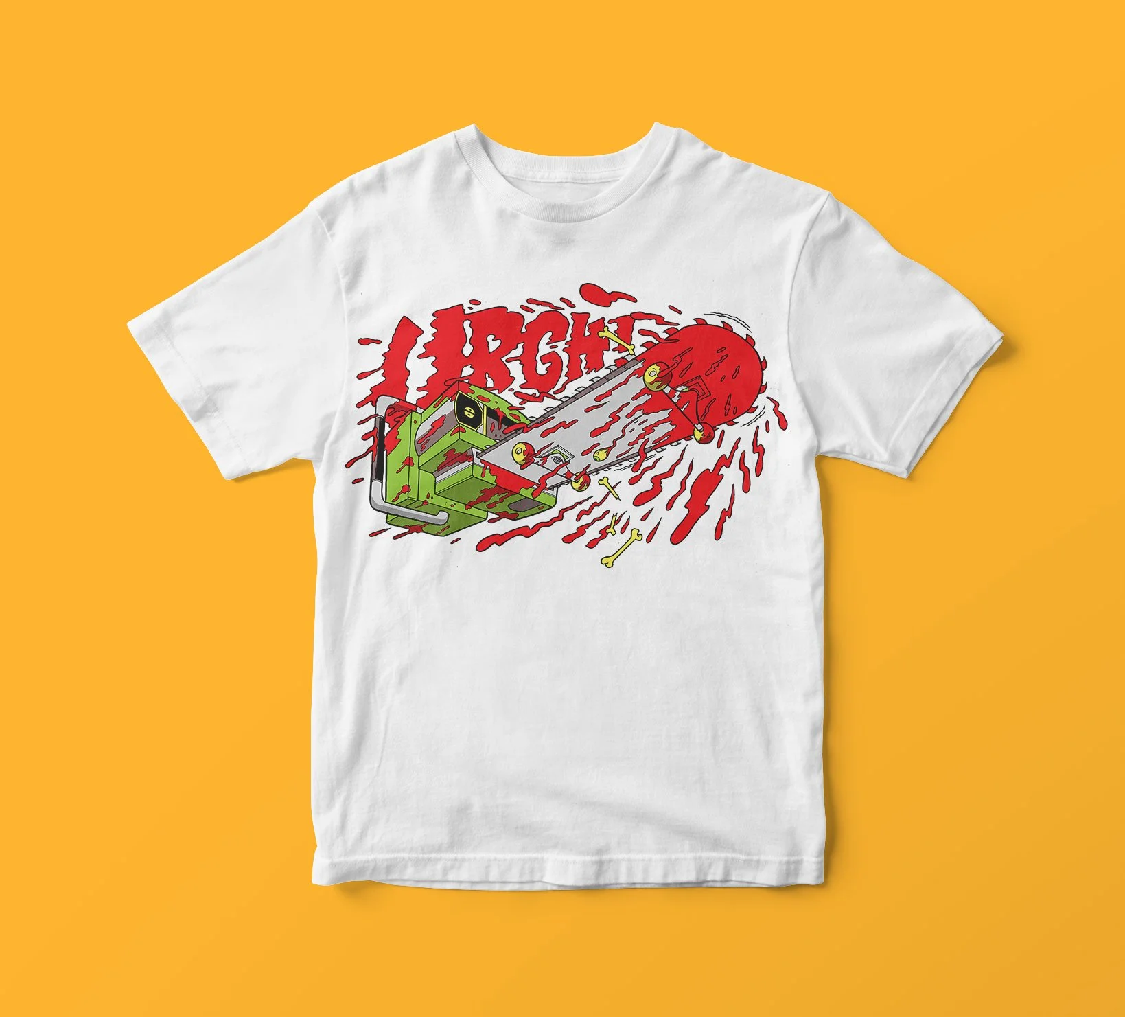 When it came to the shirt designs, I tried to incorporate the same brand of humor and fun that I put on the decks. I also got very inspired by heavy metal and punk aesthetics, which comes very naturally to me. I like to think that being an avid Tony Hawk’s Pro Skater player in my teenage years also really helped me out on this one.